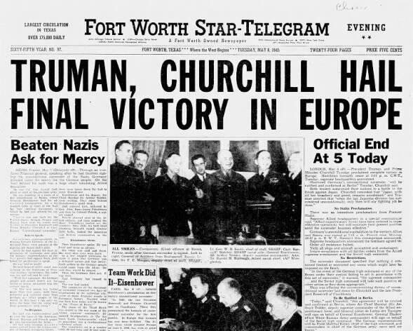 Left is one of the many newspaper articles that would have been published on may 8th, 1945, celebrating the victory of the allies over the Germans in Europe. Their victory could not have been accomplished without D-Day of June 6th, 1944, which many believe to be the crucial turning point in the war for Allied victory.